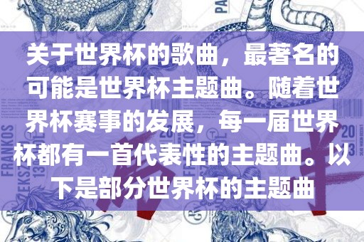 仅是部分世界杯歌曲的介绍,每一首歌曲都代表了不同的世界杯文化和精神,如需获取更多关于世界杯的歌曲信息,建议查阅相关资料或关注相关论坛和社交媒体上的讨论。