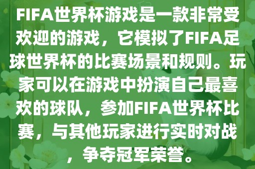 FIFA世界杯游戏是一款非常受欢迎的游戏,它模拟了FIFA足球世界杯的比赛场景和规则。玩家可以在游戏中扮演自己最喜欢的球队,参加FIFA世界杯比赛,与其他玩家进行实时对战,争夺冠军荣誉。