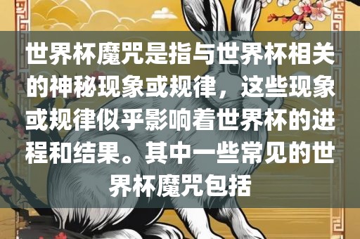 摘要:世界杯魔咒是指与世界杯相关的神秘现象或规律,它们似乎影响着世界杯的进程和结果。常见的世界杯魔咒包括诸如卫冕冠军魔咒、神秘力量魔咒等,这些现象引发了人们的广泛讨论和猜测。这些魔咒似乎为世界杯增添了一层神秘色彩,使得比赛更加引人入胜。