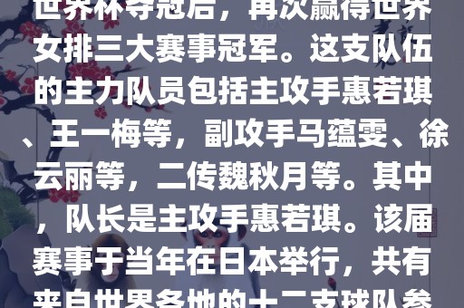 在2011年日本女排世界杯赛中,中国女排以全胜战绩摘得冠军,这也是中国女排继1995年世界杯夺冠后,再次赢得世界女排三大赛事冠军。这支队伍的主力队员包括主攻手惠若琪、王一梅等,副攻手马蕴雯、徐云丽等,二传魏秋月等。其中,队长是主攻手惠若琪。该届赛事于当年在日本举行,共有来自世界各地的十二支球队参与角逐。此外,该届世界杯的最佳发球奖由日本名将木村纱织获得。