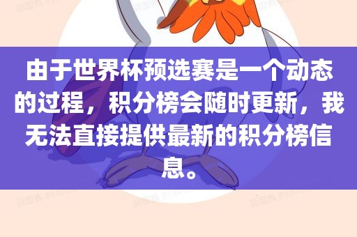 由于世界杯预选赛是一个动态的过程,积分榜会随时更新,我无法直接提供最新的积分榜信息。