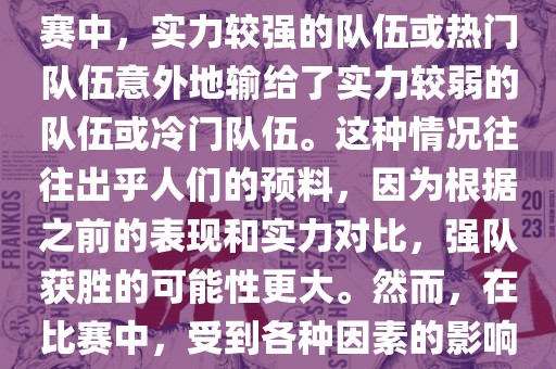 世界杯爆冷指的是在世界杯比赛中,实力较强的队伍或热门队伍意外地输给了实力较弱的队伍或冷门队伍。这种情况往往出乎人们的预料,因为根据之前的表现和实力对比,强队获胜的可能性更大。然而,在比赛中,受到各种因素的影响,结果可能出乎预料。