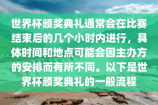 世界杯颁奖典礼通常会在比赛结束后的几个小时内进行,具体时间和地点可能会因主办方的安排而有所不同。以下是世界杯颁奖典礼的一般流程